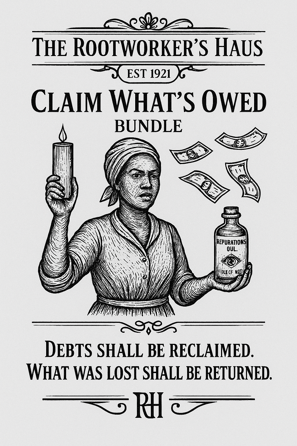 Call back the wealth, respect, and opportunities that were delayed, denied, or taken. The Claim What’s Owed Bundle combines two powerhouse tools—Reparations Oil and the Reparations Candle—to break financial chains, correct energetic imbalances, and summon what is rightfully yours.
