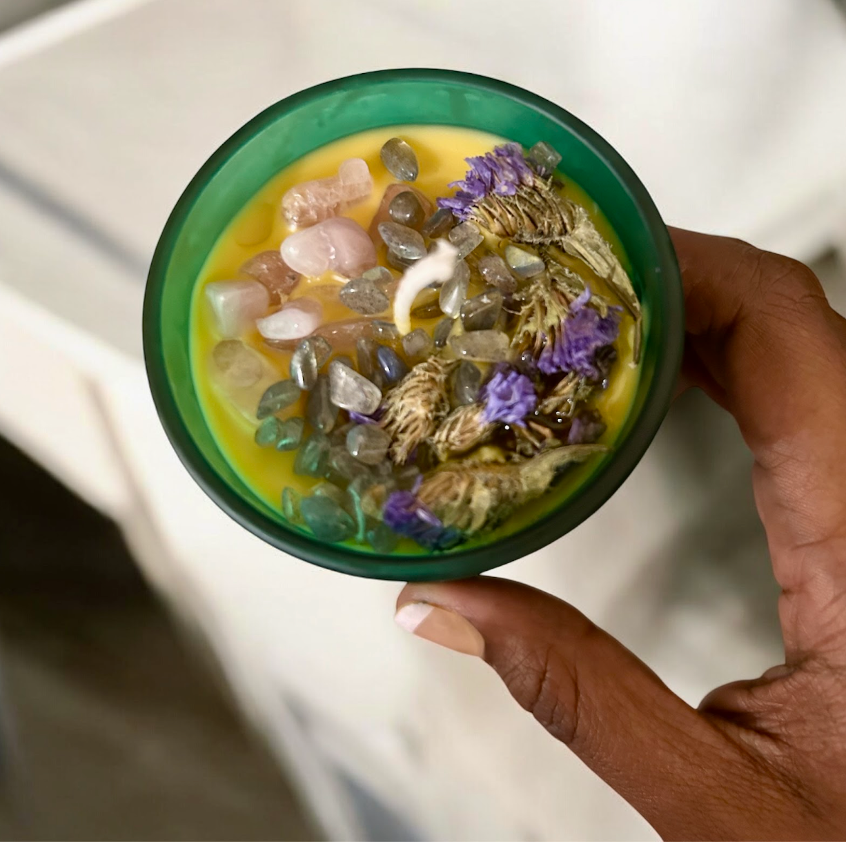 Before pouring, each candle is set with intention, focusing on its unique purpose—whether for abundance, love, protection, justice, or uncrossing. Once poured, the candles are fixed with carefully chosen ingredients that enhance their power, such as cinnamon for prosperity, mugwort for intuition, or black salt for banishing.