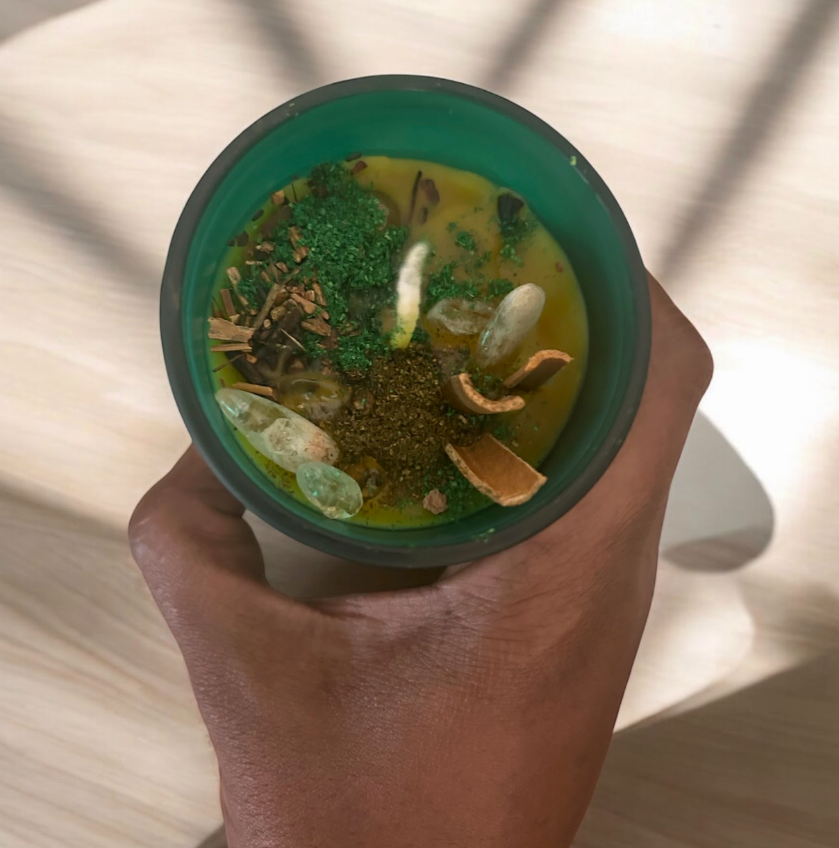 Before pouring, each candle is set with intention, focusing on its unique purpose—whether for abundance, love, protection, justice, or uncrossing. Once poured, the candles are fixed with carefully chosen ingredients that enhance their power, such as cinnamon for prosperity, mugwort for intuition, or black salt for banishing.